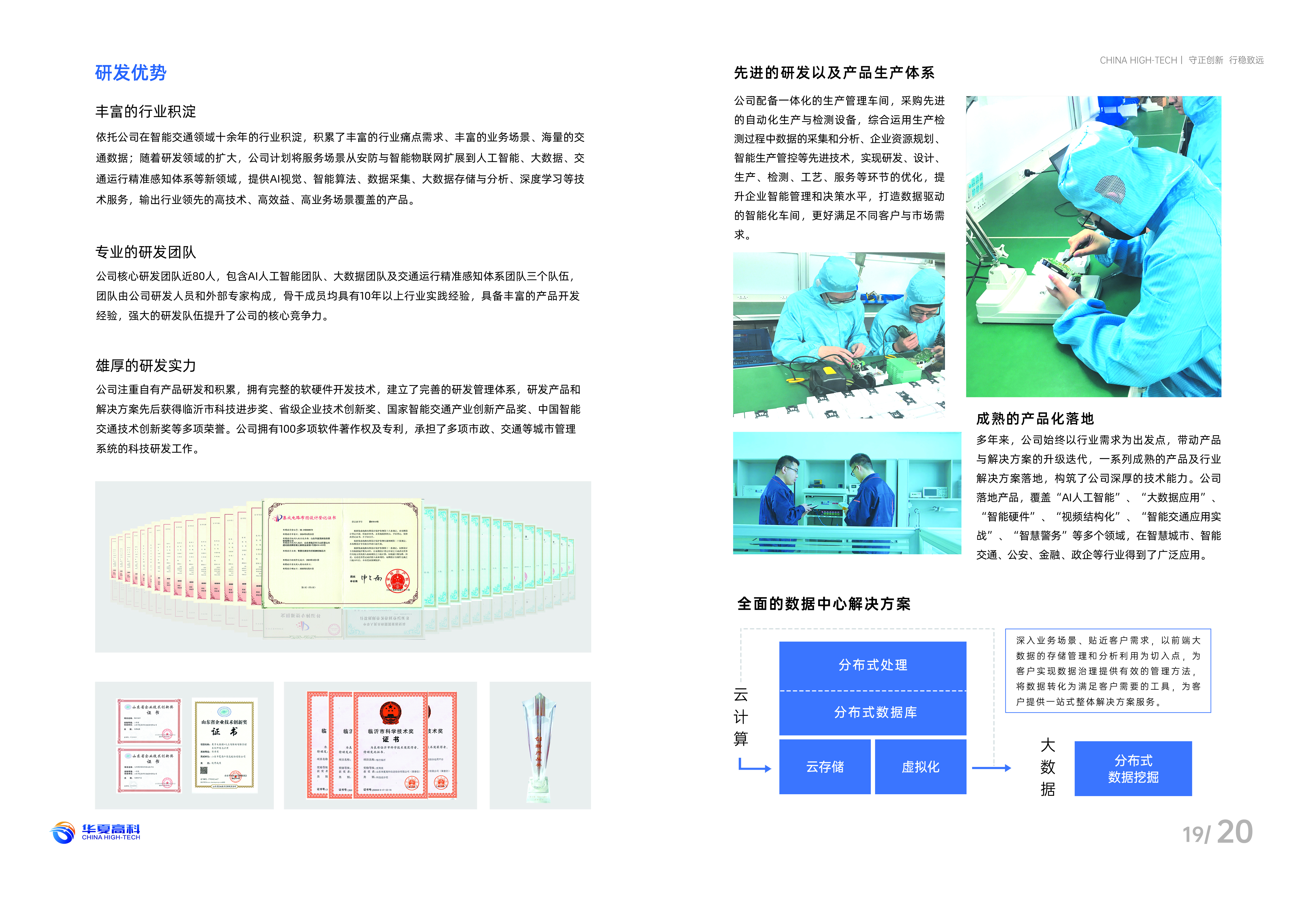 华夏高科成立于 2004 年,2018 年挂牌全国中小企业股份转让系统(股票代码:873027),2021 年进入新三板创新层,是国内智能化、信息化领域优秀的系统集成服务供应商,集科研开发、生产销售、产品集成于一体的综合型高新技术企业。 公司聚焦智慧交通领域,依托全域感知、智慧互联、智慧中台等核心技术与产品,以边缘数据融合、AI 全息感知分析等前沿技术,打造智慧交通全场景解决方案,赋能城市智慧化建设与行业深度应用。 公司秉持 “以科技求发展,以服务求生存” 的经营理念,持续推进技术创新与成果转化。先后承担省部级科研项目 6 项、市区级科研项目 8 项,拥有自主知识产权 142 项,完成科技成果评价 10 余项。 未来,华夏高科将以技术创新驱动产业升级,致力于成为行业领先、客户信赖的数智化产品与服务提供商。